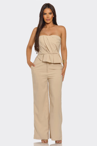 L'ensemble deux pièces Sculpted Grace offre un équilibre raffiné entre structure et fluidité pour une allure moderne et élégante. Ce haut bustier sans bretelles, orné de plis asymétriques, apporte texture et originalité. Un péplum délicat souligne la taille, créant une silhouette flatteuse et féminine. Associé à un pantalon taille haute à jambes larges, l'ensemble allonge la silhouette tout en conservant une allure à la fois décontractée et structurée. Conçu pour allier confort et sophistication, il se prête aussi bien aux occasions formelles qu'aux tenues de tous les jours. Idéal pour les événements spéciaux ou professionnels, cet ensemble incarne l'assurance et un style naturel.